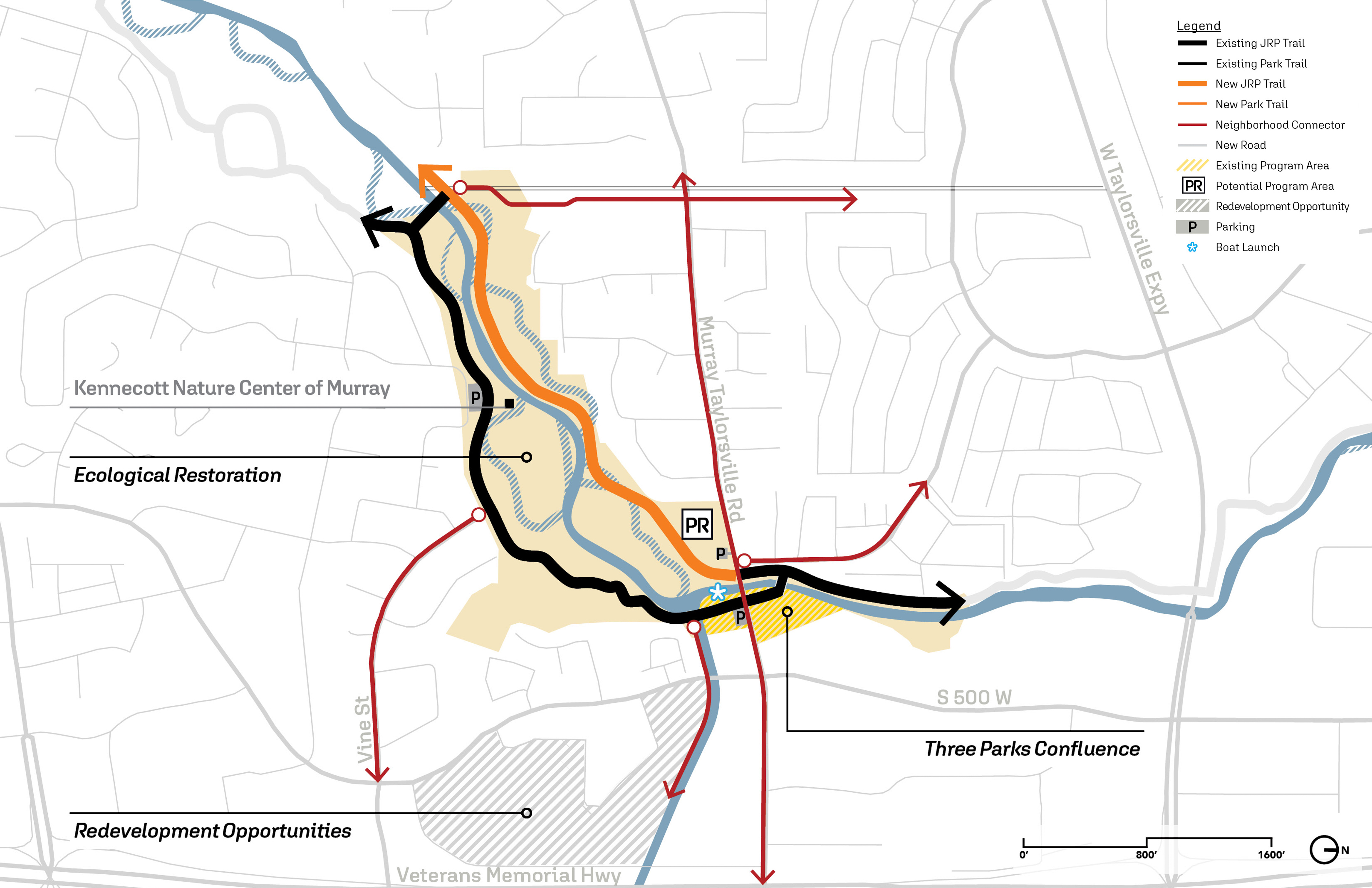 While this segment of the Jordan River has not been as straightened and modified as the river channel in Segment 1, there is still a continued focus of proposing significant ecological enhancements by re-routing the side channels to follow existing topography and connecting side channels with ponds and improved wetlands. These river restoration recommendations would improve stormwater pollution through green infrastructure, dissipate stream energy to create managed and safe public amenities, and improve riparian conditions for healthier habitats.