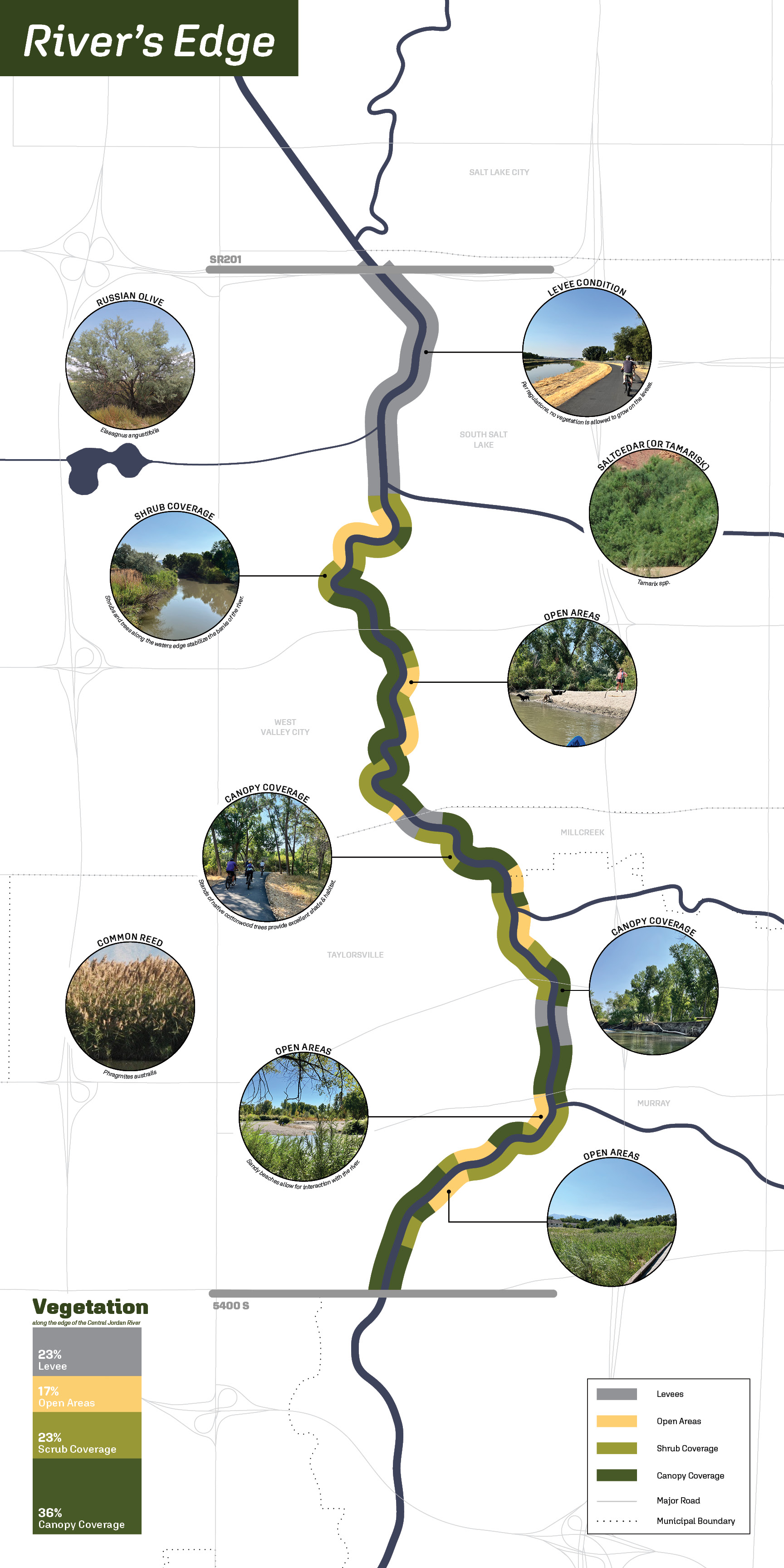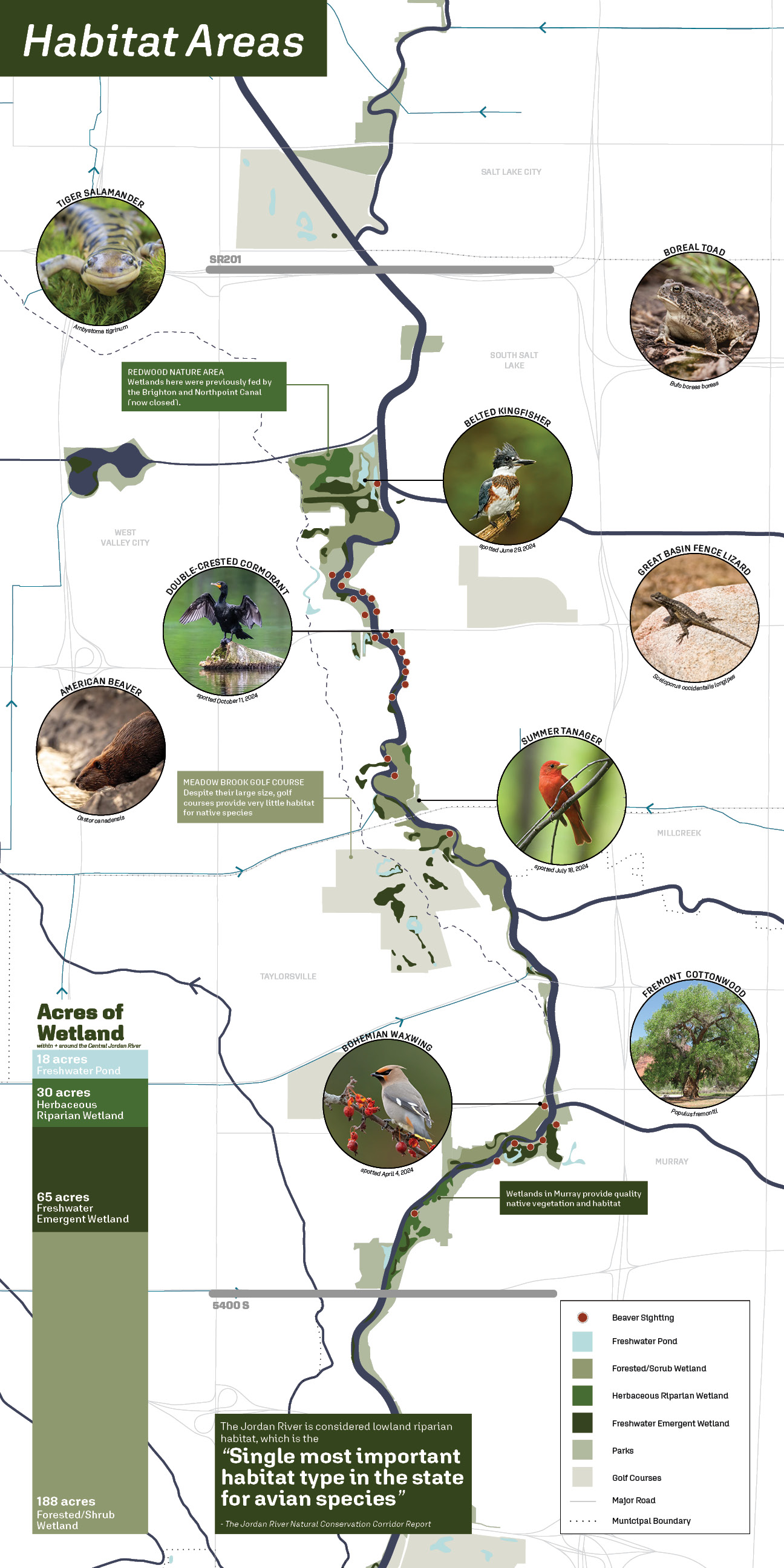 Humans have dramatically changed the Jordan River, diminishing its natural qualities. Water quality across the watershed has been heavily impacted, with increased impervious surfaces and irregular dam releases from Utah Lake causing fluctuating flow rates. The river’s path has also been modified through channelization, dredging, and levee construction. Despite these changes, quality habitat remains along its banks, offering refuge for native species. Today, visitors can spot various birds, mammals, and amphibians who call this river home.